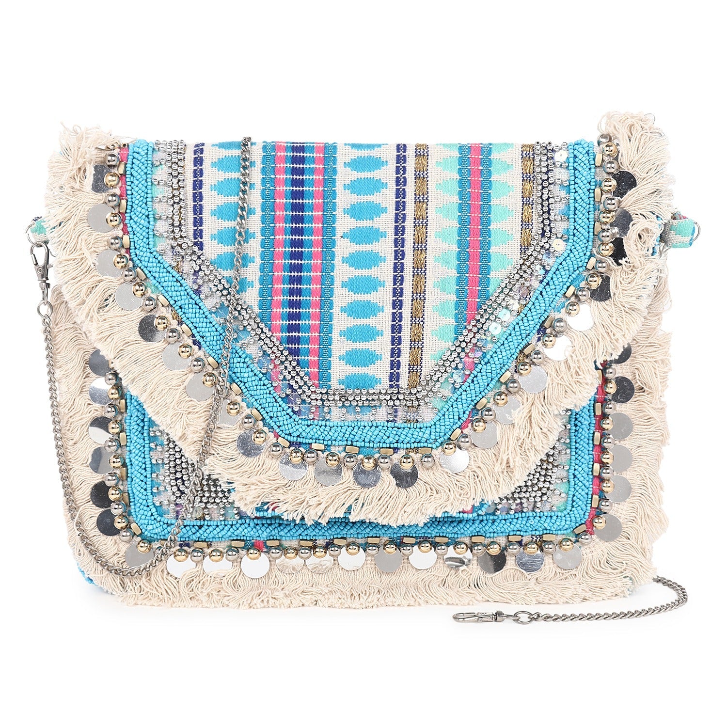 Our best-selling Bohemian Flap bags will elevate your Banjara appearance with its elaborate coin and bead work on high quality fabric, making a fashion statement.Artfully embroidered and fully beaded on the front, with plain fabric on the back. Ideal For: Gatherings, date evenings, parties, or show it off with regular clothes.