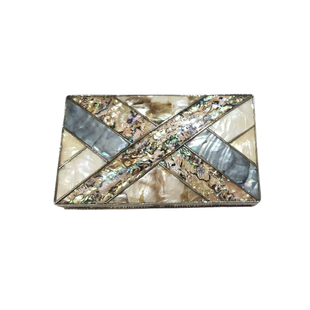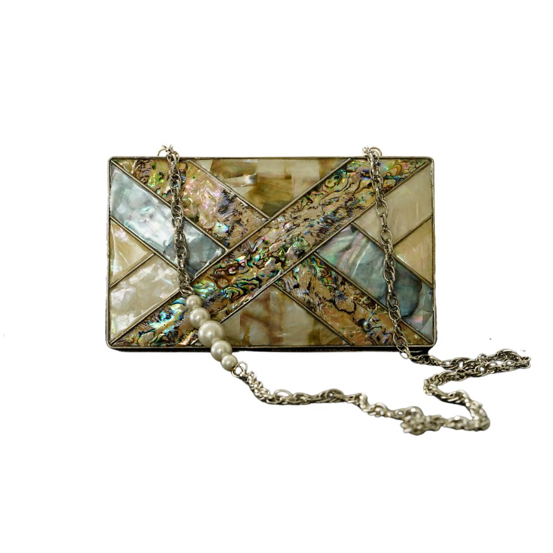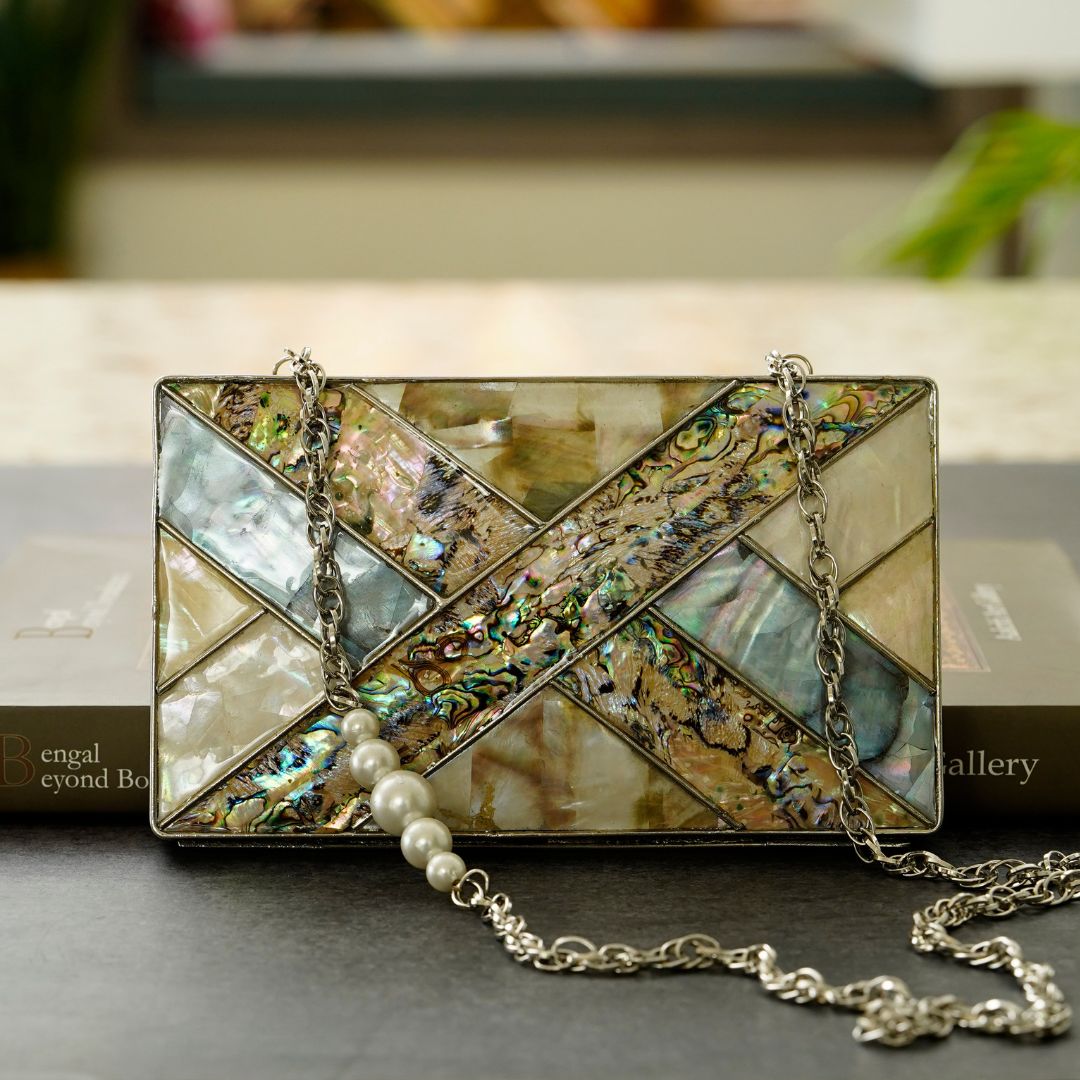 The gorgeous Brass Mother of Pearl clutch is the epitome of elegance and creativity. This work of art has been meticulously created, and the 3D embossed details offer volume and depth. It is a distinctive accessory due to its distinctive shape, which radiates elegance and modernity.