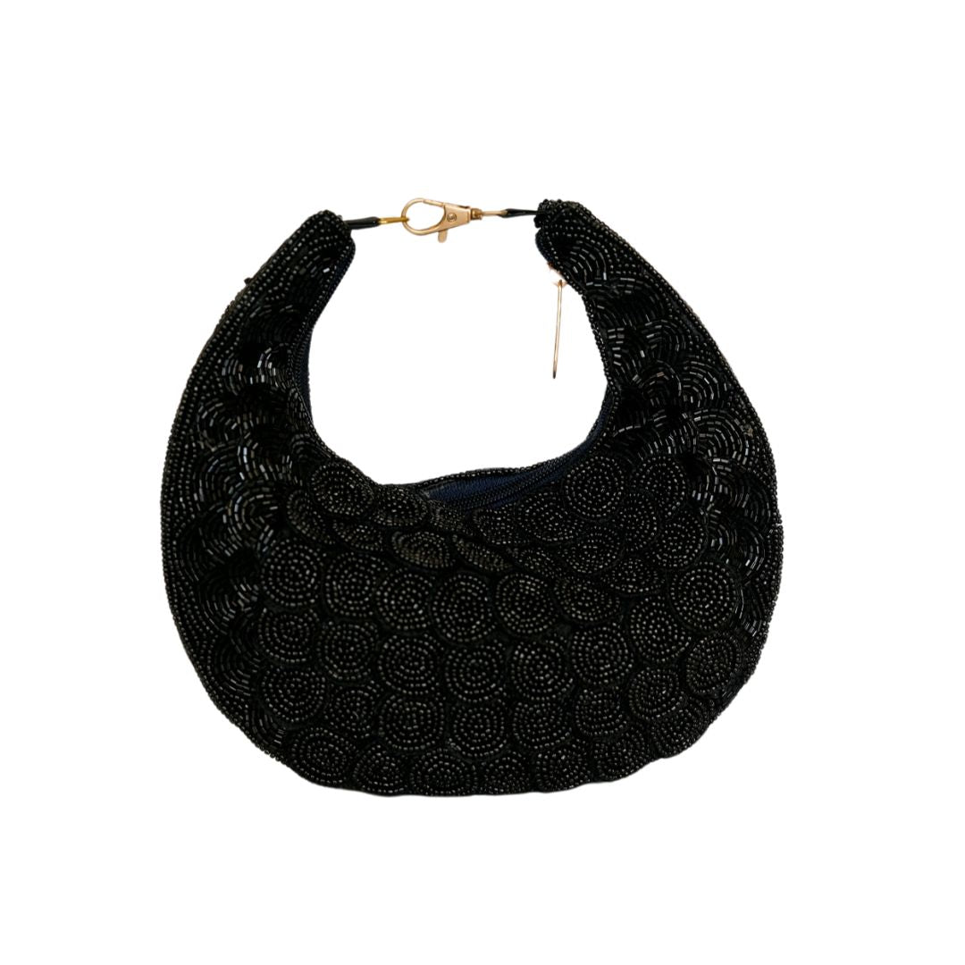 This exquisitely crafted black boat beaded soft pouch bag is embellished with scale pattern bead work and features an enchanting design. A sophisticated and contemporary interpretation of these traditional bags will add a touch of glitz to your ensemble.