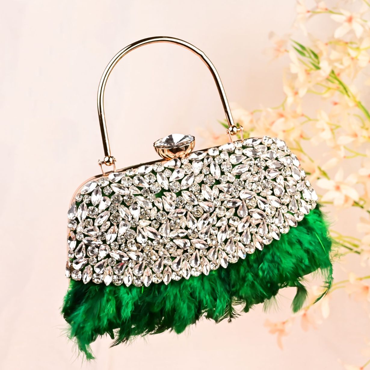 Elevate your evening outfit with the stunning Green Toned Crystal Beaded Clutch Bag, a true masterpiece of beauty and sophistication. This magnificent feather handbag is sure to turn heads with its unusual combination of sparkling crystals and fun green feathers, making it an ideal accessory for weddings, parties, galas, and other special occasions.