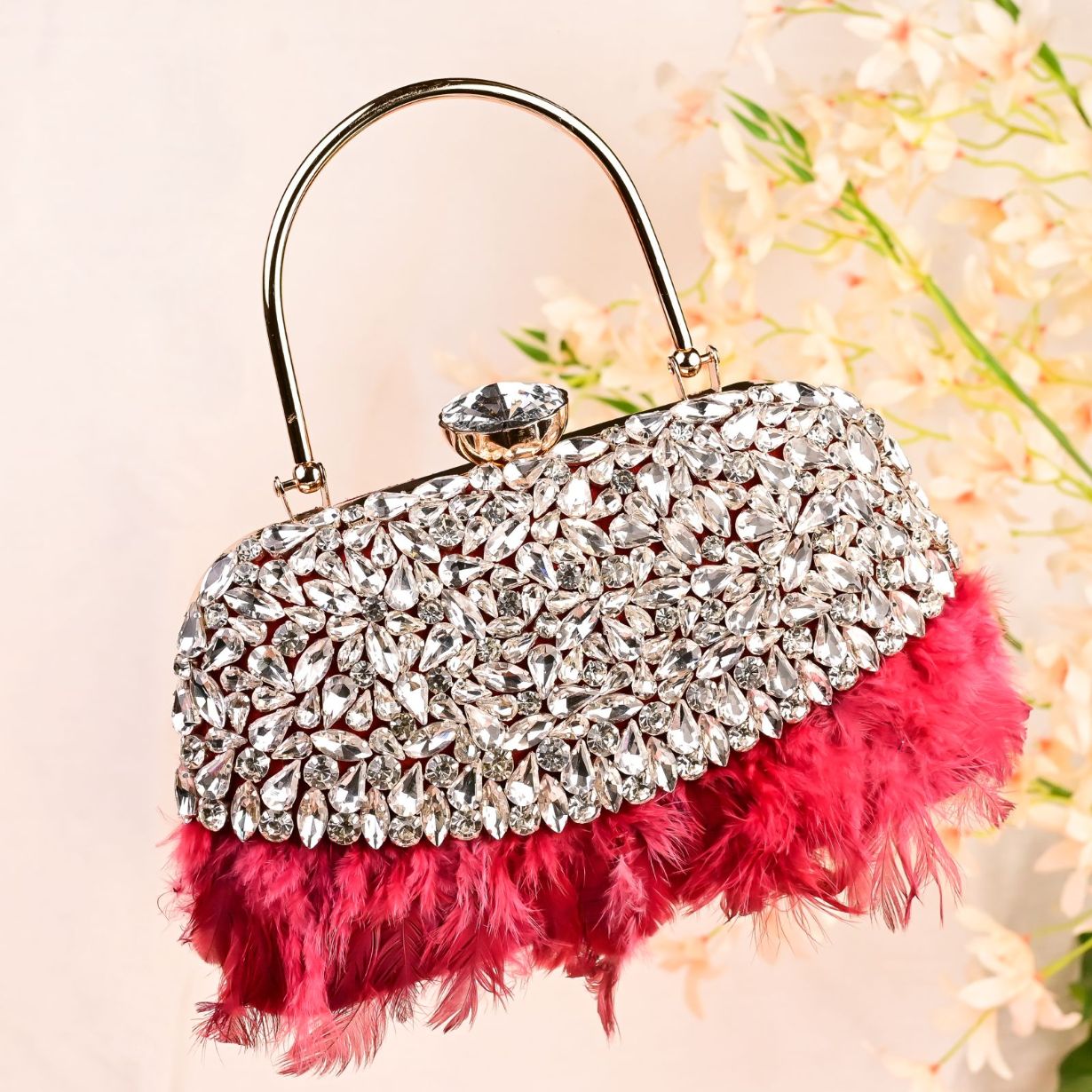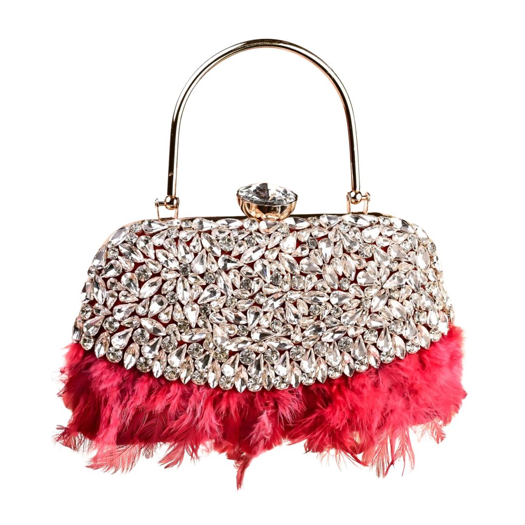 Elevate your evening outfit with the stunning Red Toned Crystal Beaded Clutch Bag, a true masterpiece of beauty and sophistication. This magnificent handbag is sure to turn heads with its unusual combination of sparkling crystals and fun red feathers, making it an ideal accessory for weddings, parties, galas, and other special occasions.
