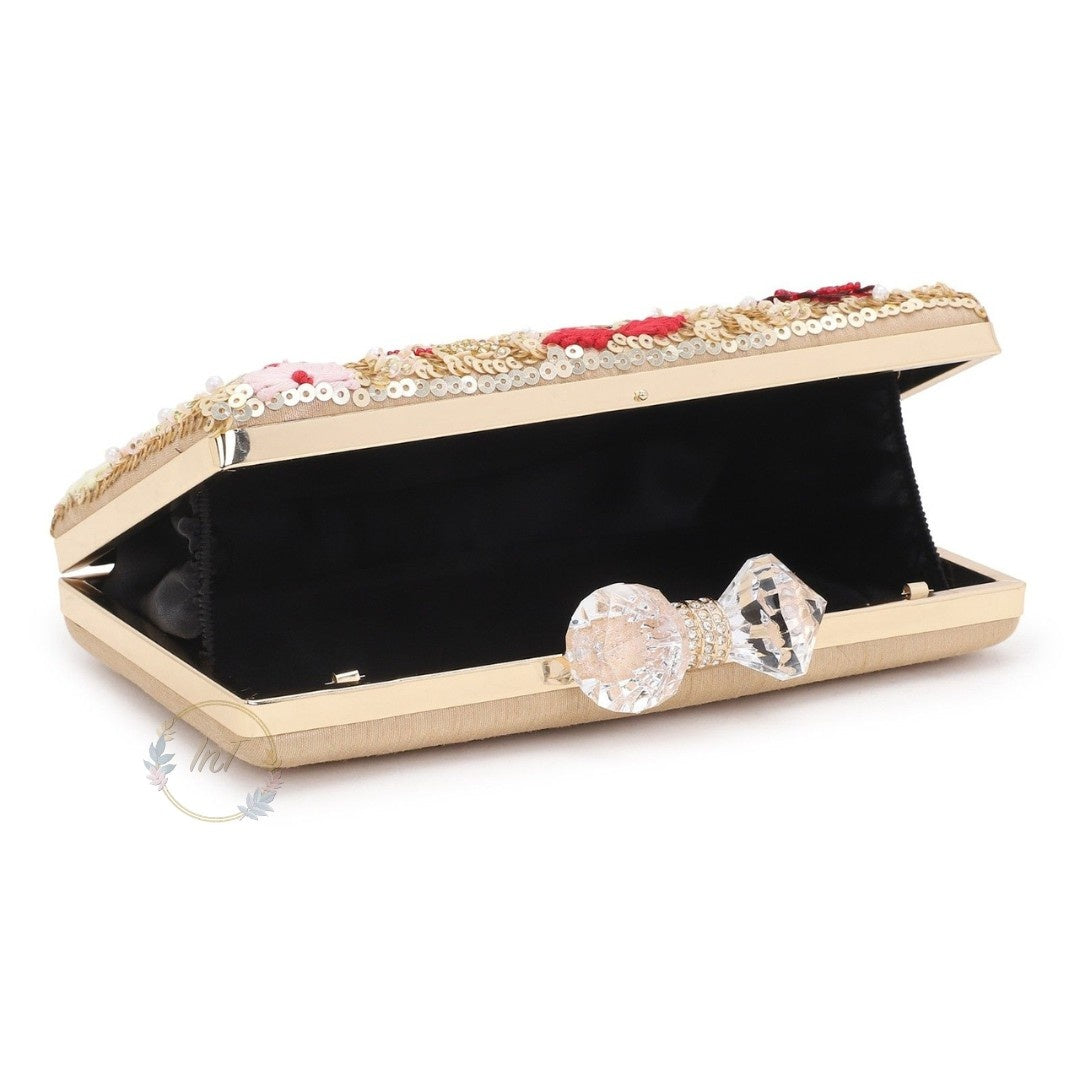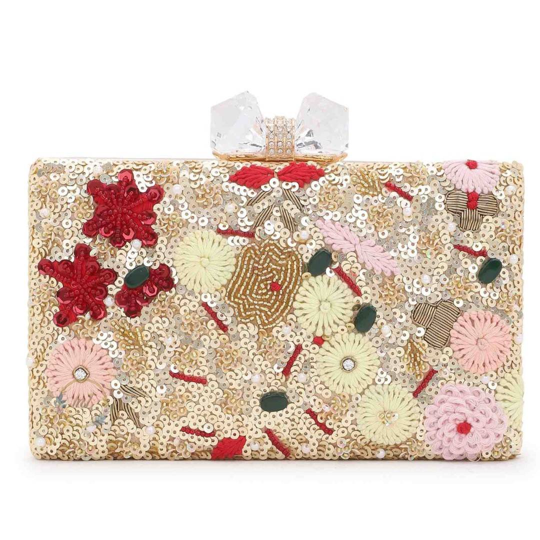 Elevate your ensemble with this handcrafted embroidered clutch, a luxurious fusion of traditional Indian artistry and modern elegance. Featuring intricate floral motifs, shimmering gold sequins, and a crystal bow clasp, this designer clutch is the perfect accessory for weddings, sangeet nights, festive gatherings, and cocktail parties.