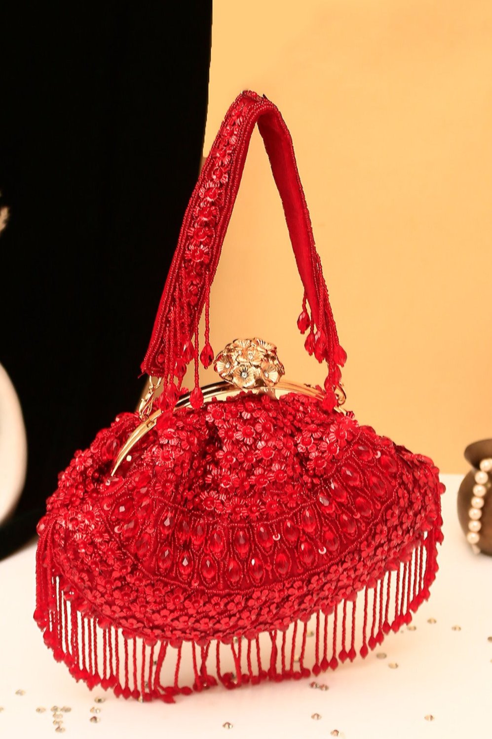 This exquisitely crafted golden soft pouch bag is embellished with sequin bead work and features an enchanting design with tassels at the end. Drops of pearls accentuate its elegant style. A sophisticated and contemporary interpretation of these traditional vintage bags will add a touch of glam to your look.