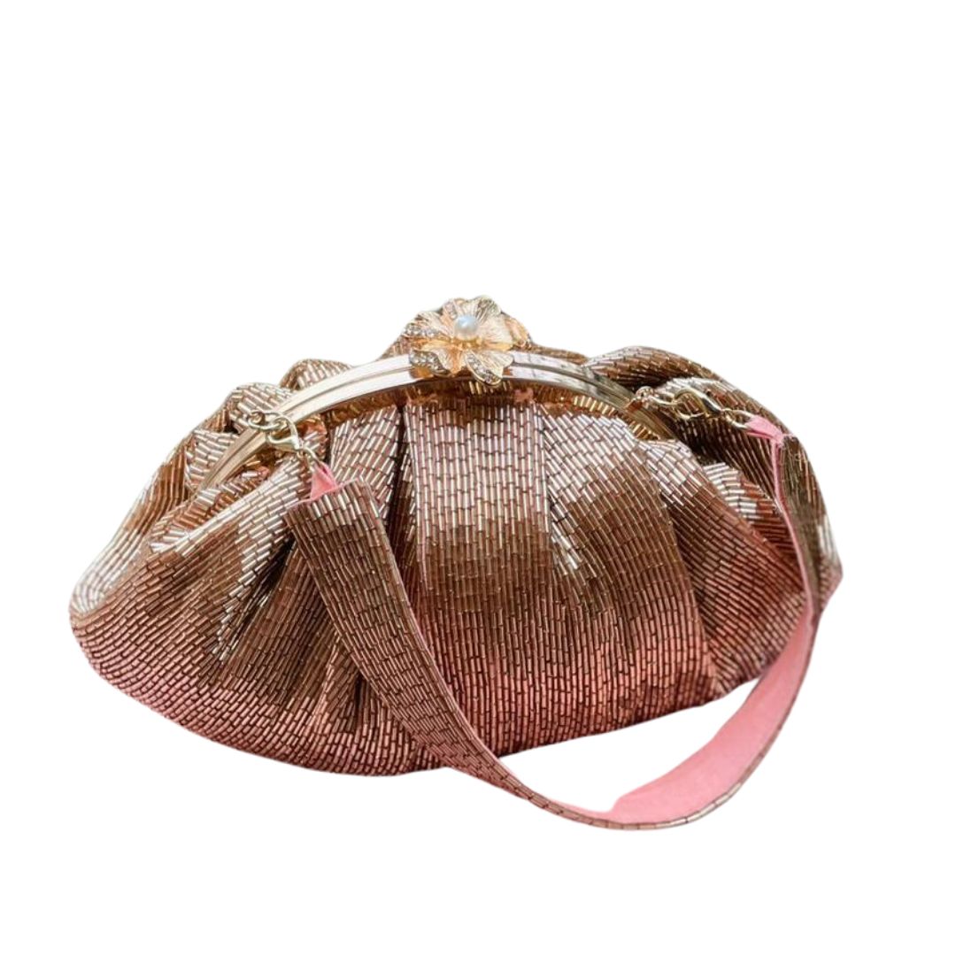 Soft Embroidery Golden Bead Pouch Bag with Handle