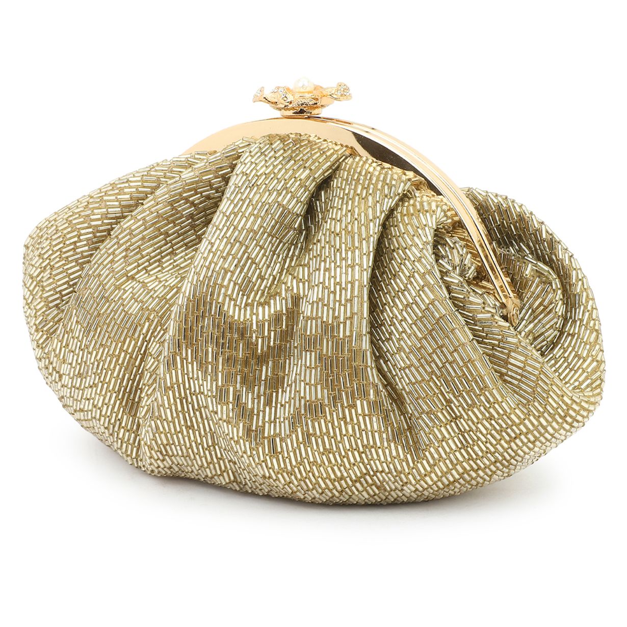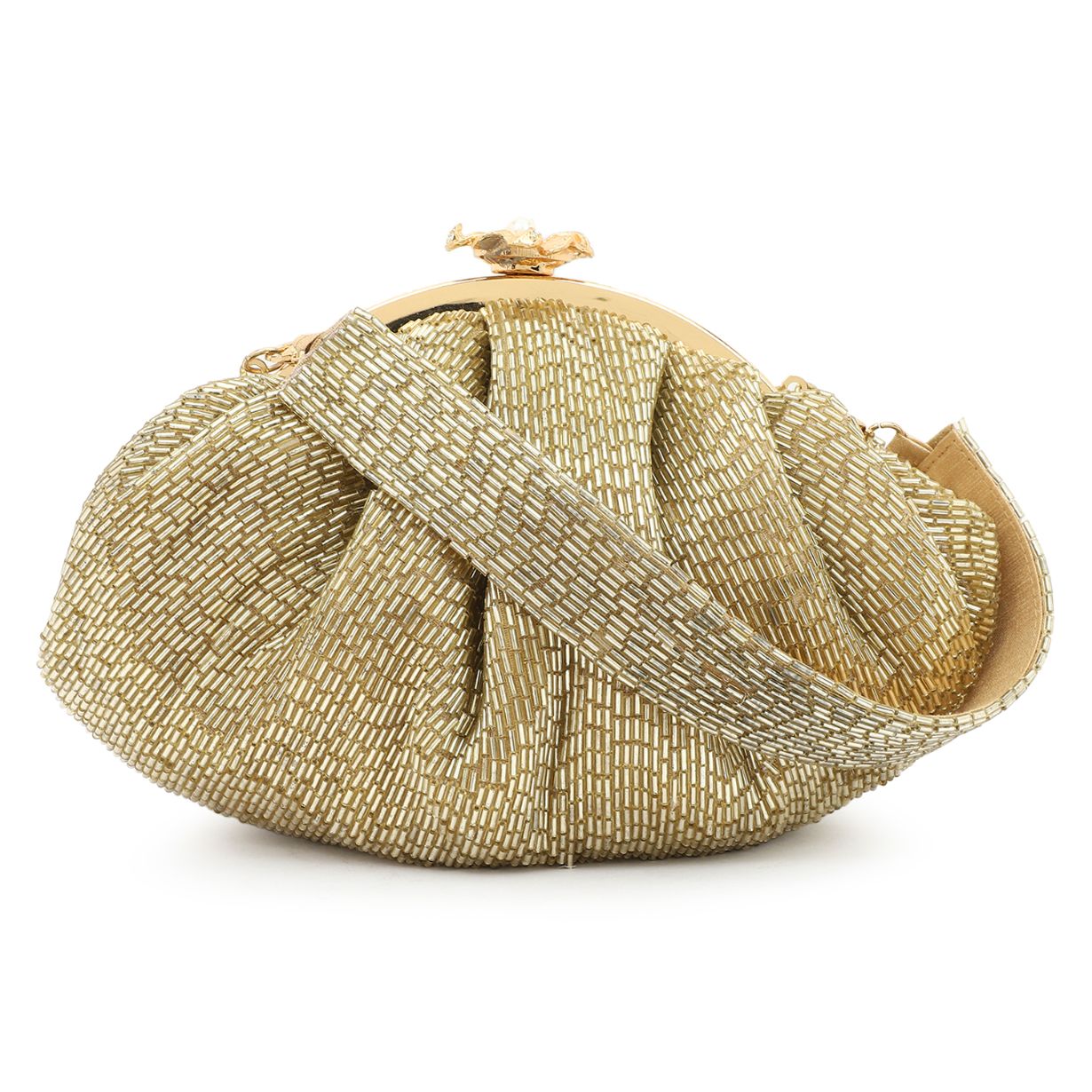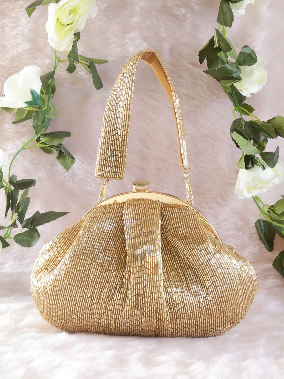 This exquisitely crafted golden soft pouch bag is embellished with cutdana bead work and features an enchanting design. A sophisticated and contemporary interpretation of these traditional vintage bags will add a hint of glitz to your ensemble.