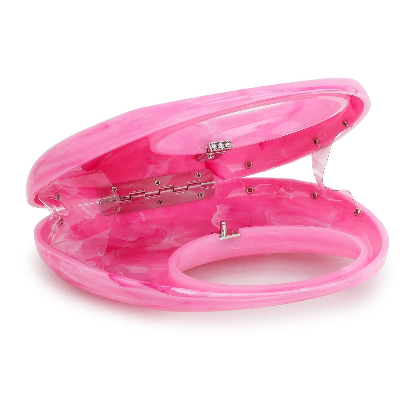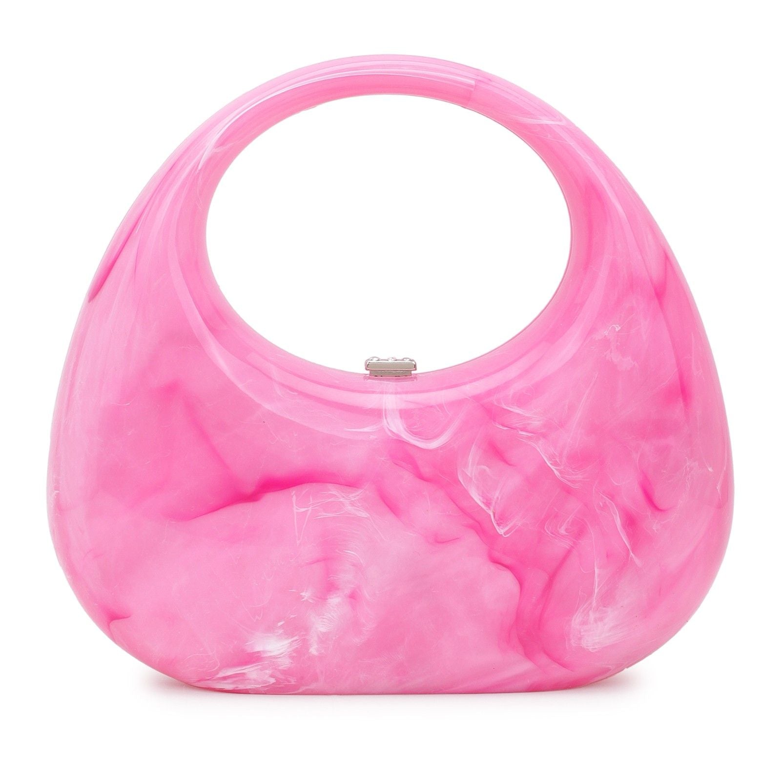 Turn heads with this eye-catching Pink Acrylic Handbag, a bold statement piece for your collection. Crafted from high-quality, marbled acrylic, this bag features a unique sculptural silhouette with a glossy, swirled pink and white finish. Its integrated circular handle ensures both comfort and style, while the top clasp closure keeps your essentials secure. Perfect for adding a pop of color to evening outfits, brunch looks, or a night out on the town.