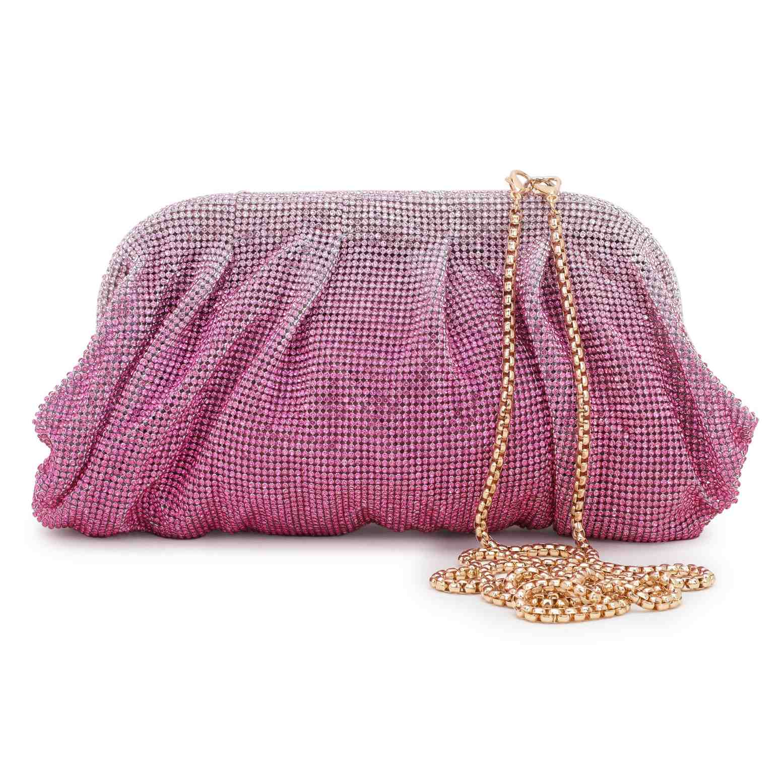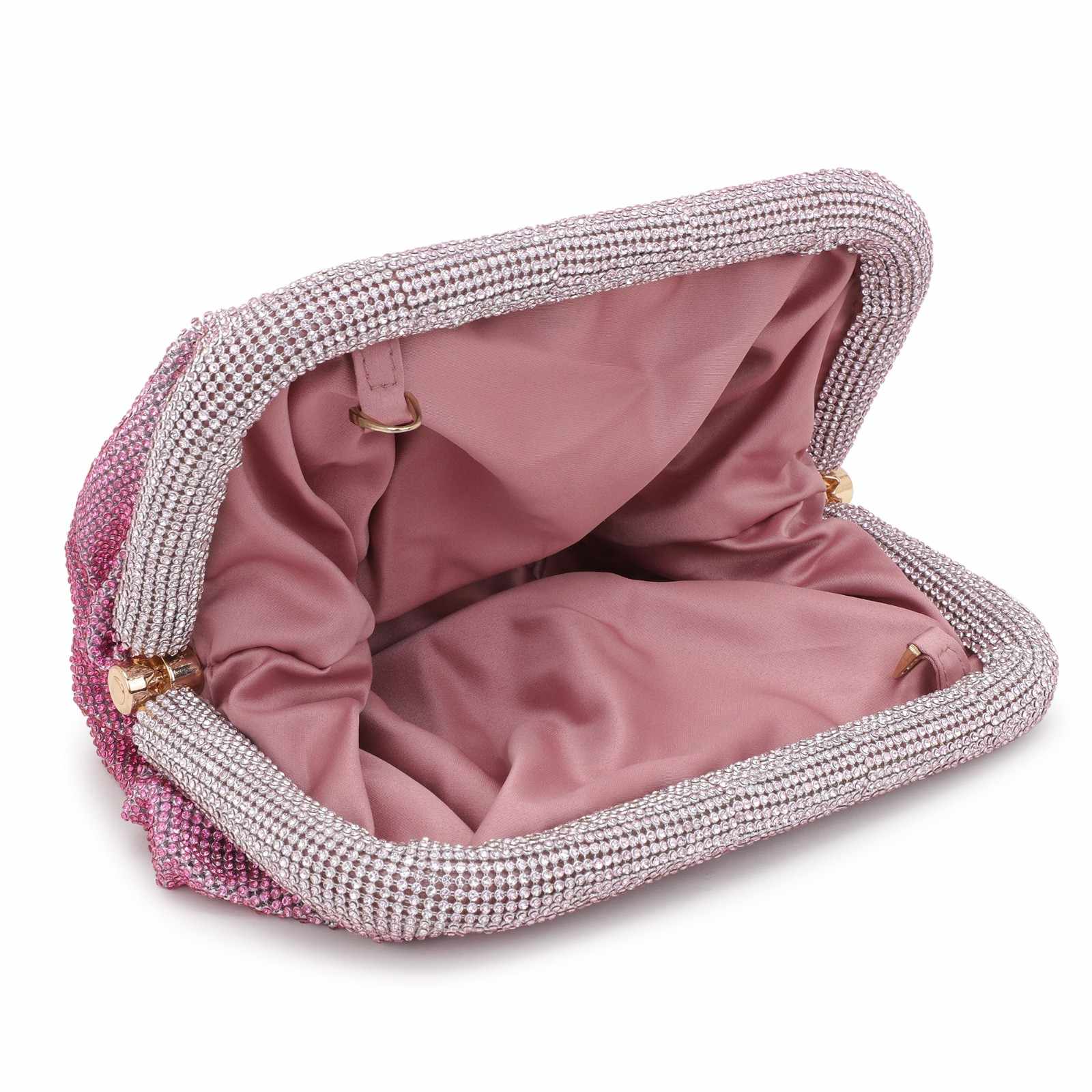 Make a bold fashion statement with this exquisite shimmering pink silver rhinestone soft pouch.Designed for glamorous evenings, special occasions, and luxurious events, this clutch adds a touch of sophistication to any outfit.