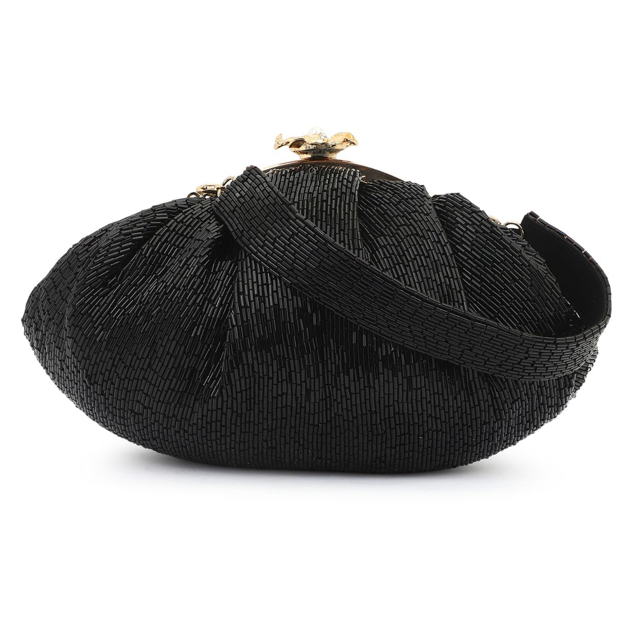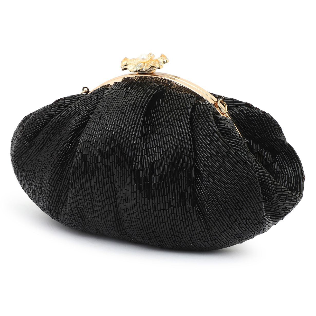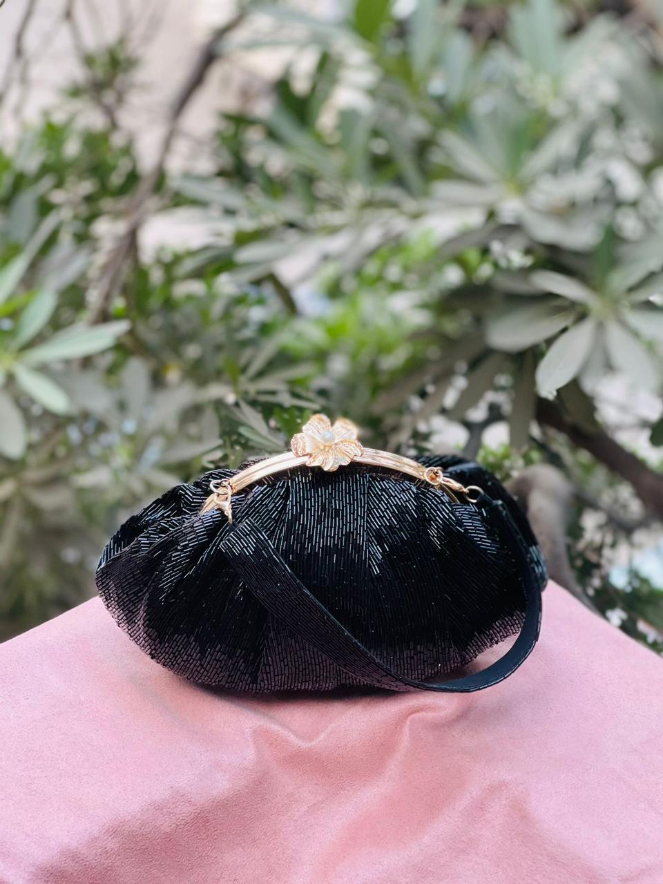Soft Embroidery Black Bead Pouch Bag with Handle