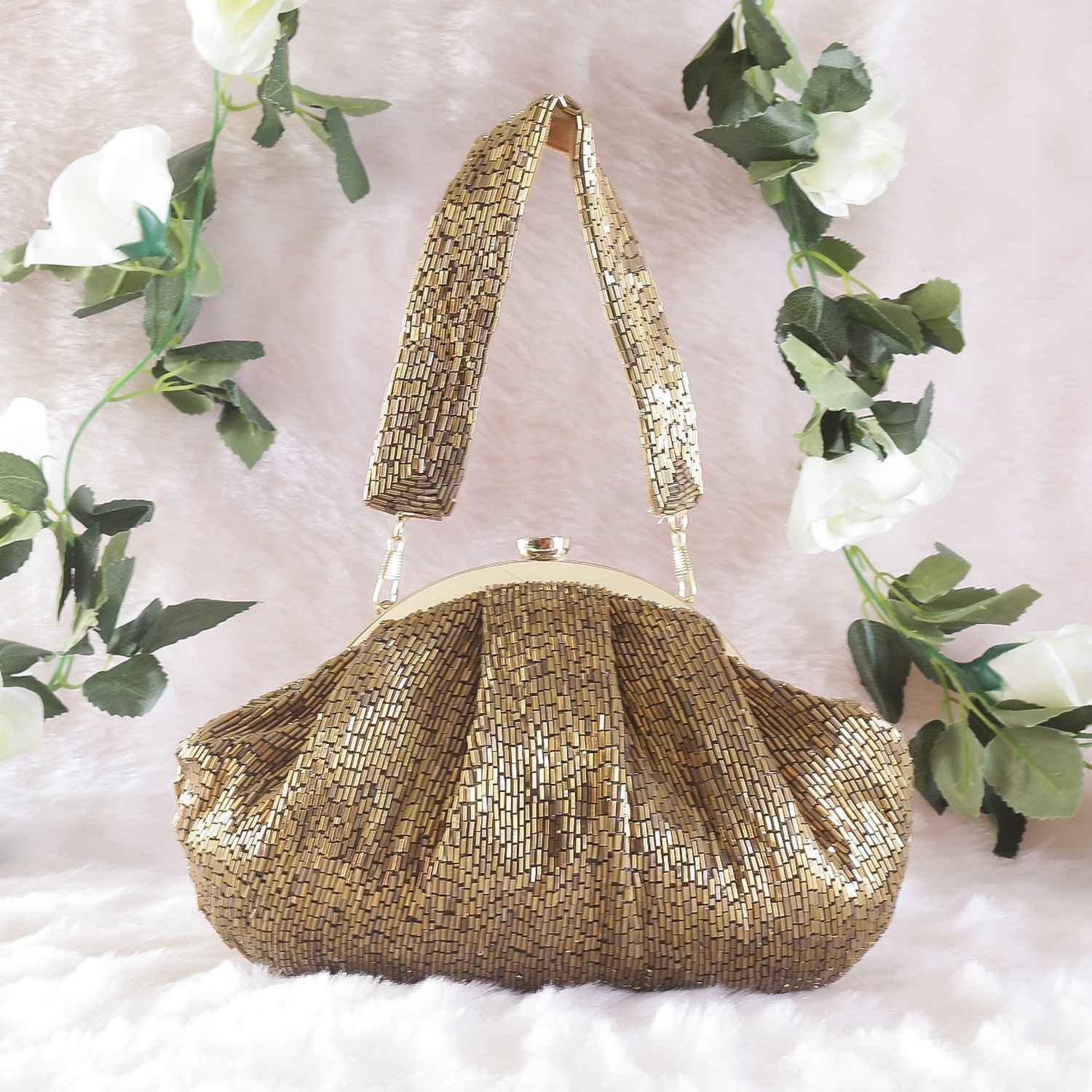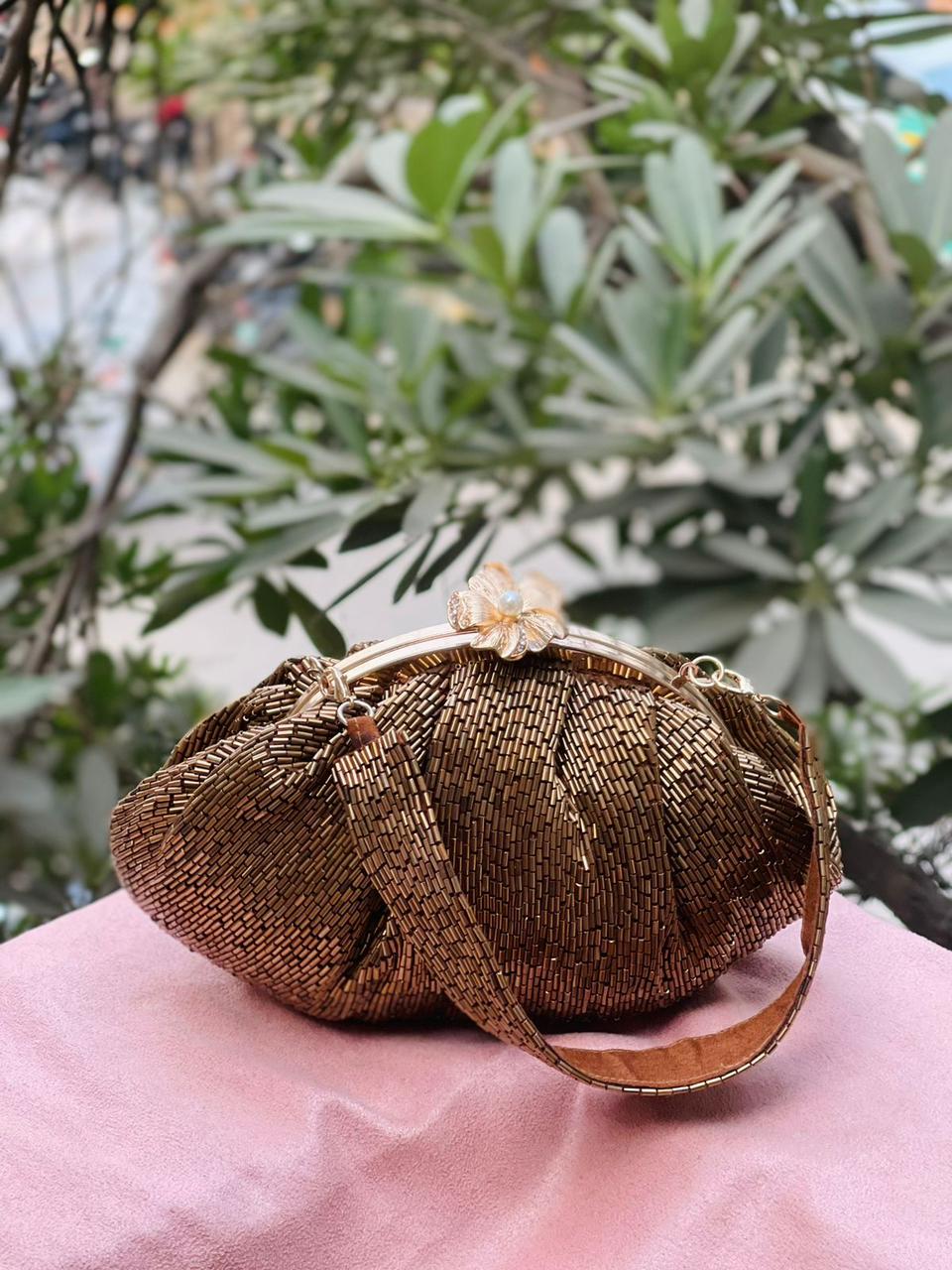 Soft Embroidery Copper Bead Pouch Bag with Handle