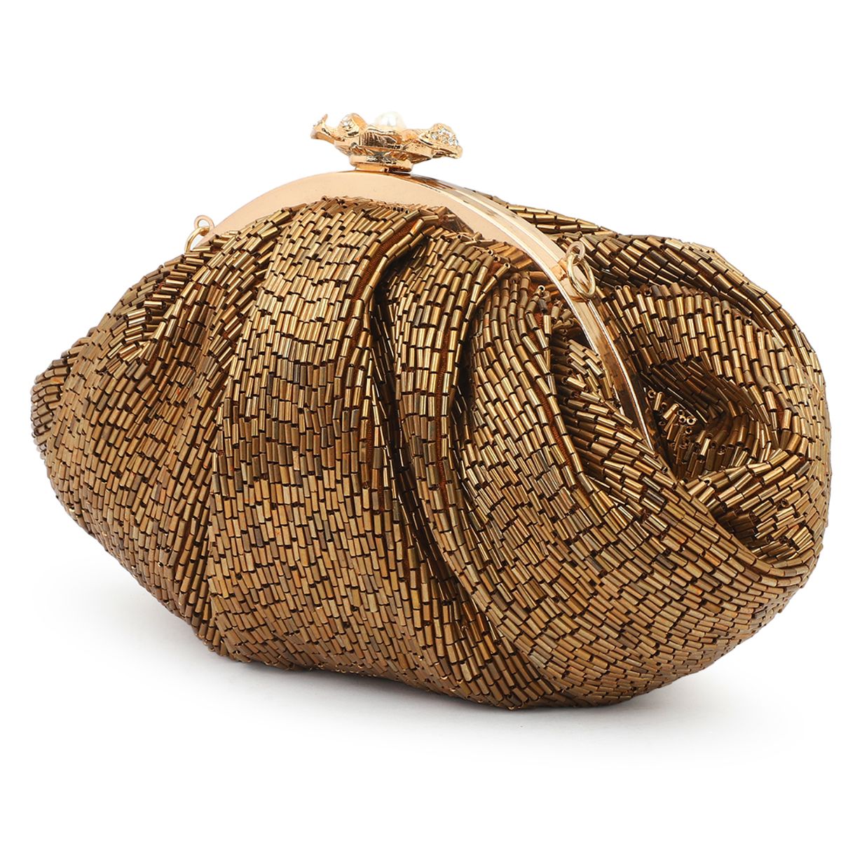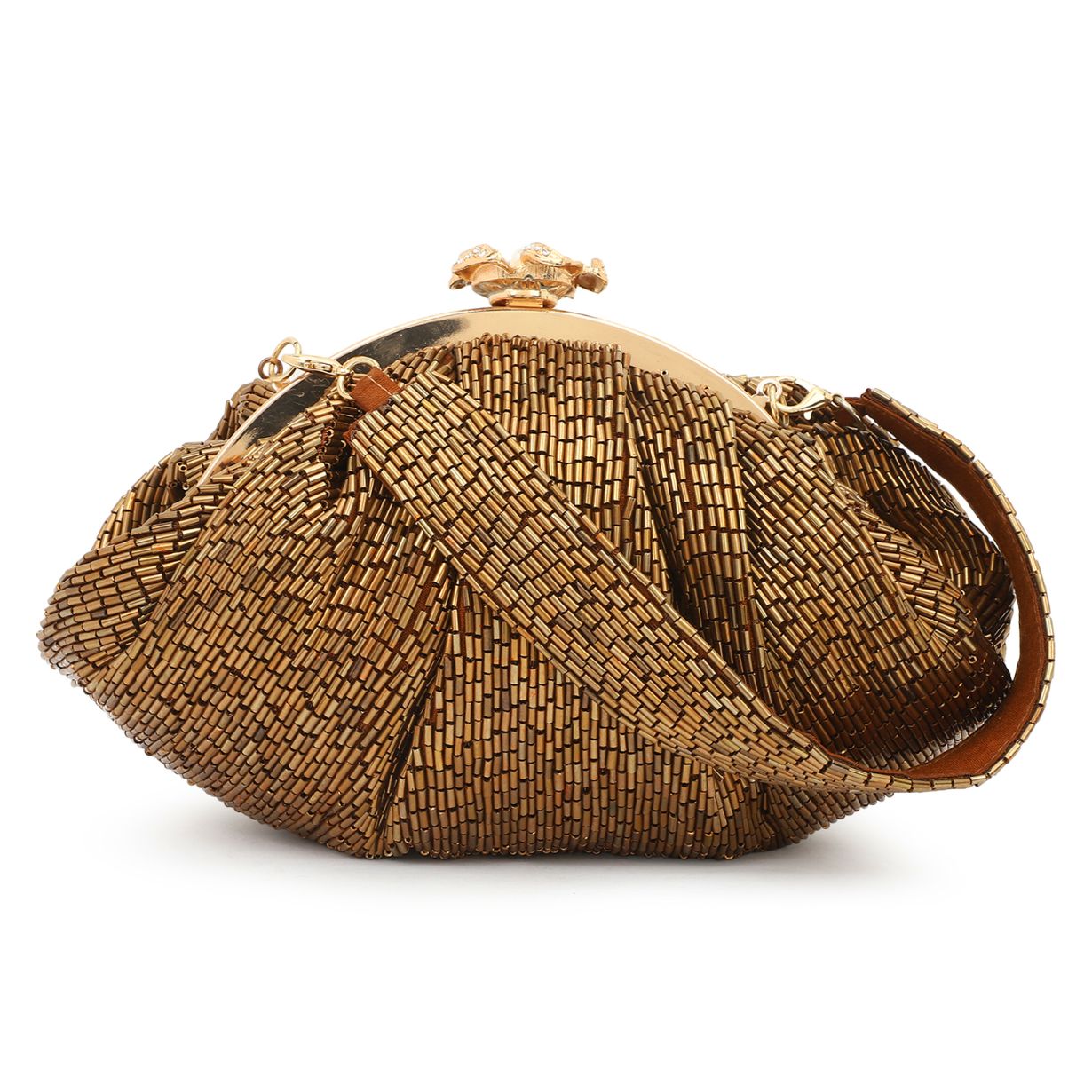 This exquisitely crafted copper soft pouch bag is embellished with cutdana bead work and features an enchanting design. A sophisticated and contemporary interpretation of these traditional vintage bags will add a hint of glitz to your ensemble.